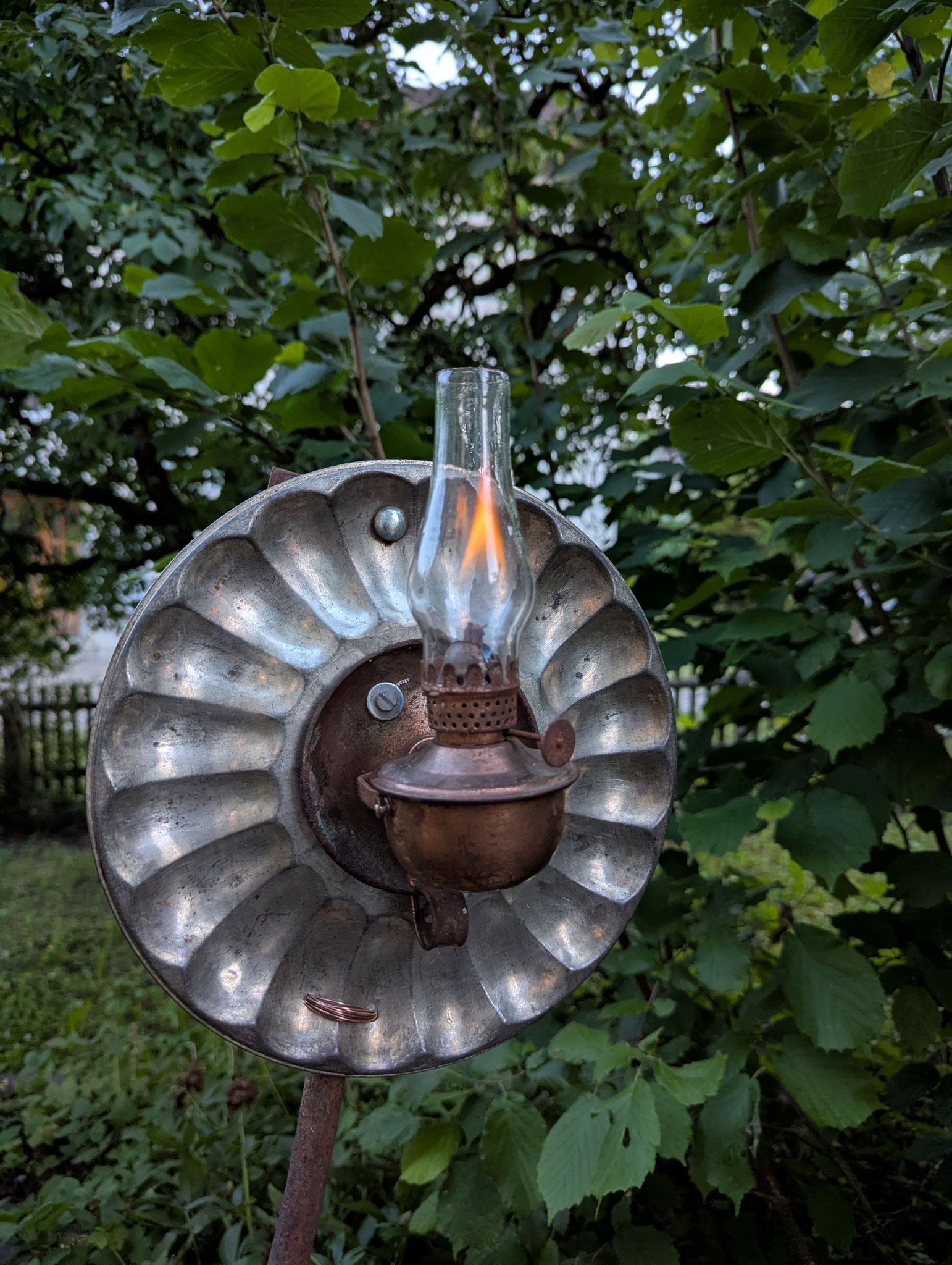 Zutaten: alte Oellampe, Metall von einem alten Lamettaträger (Christbaumsständer), Metallrohr, Metallscheibe und Schrauben.