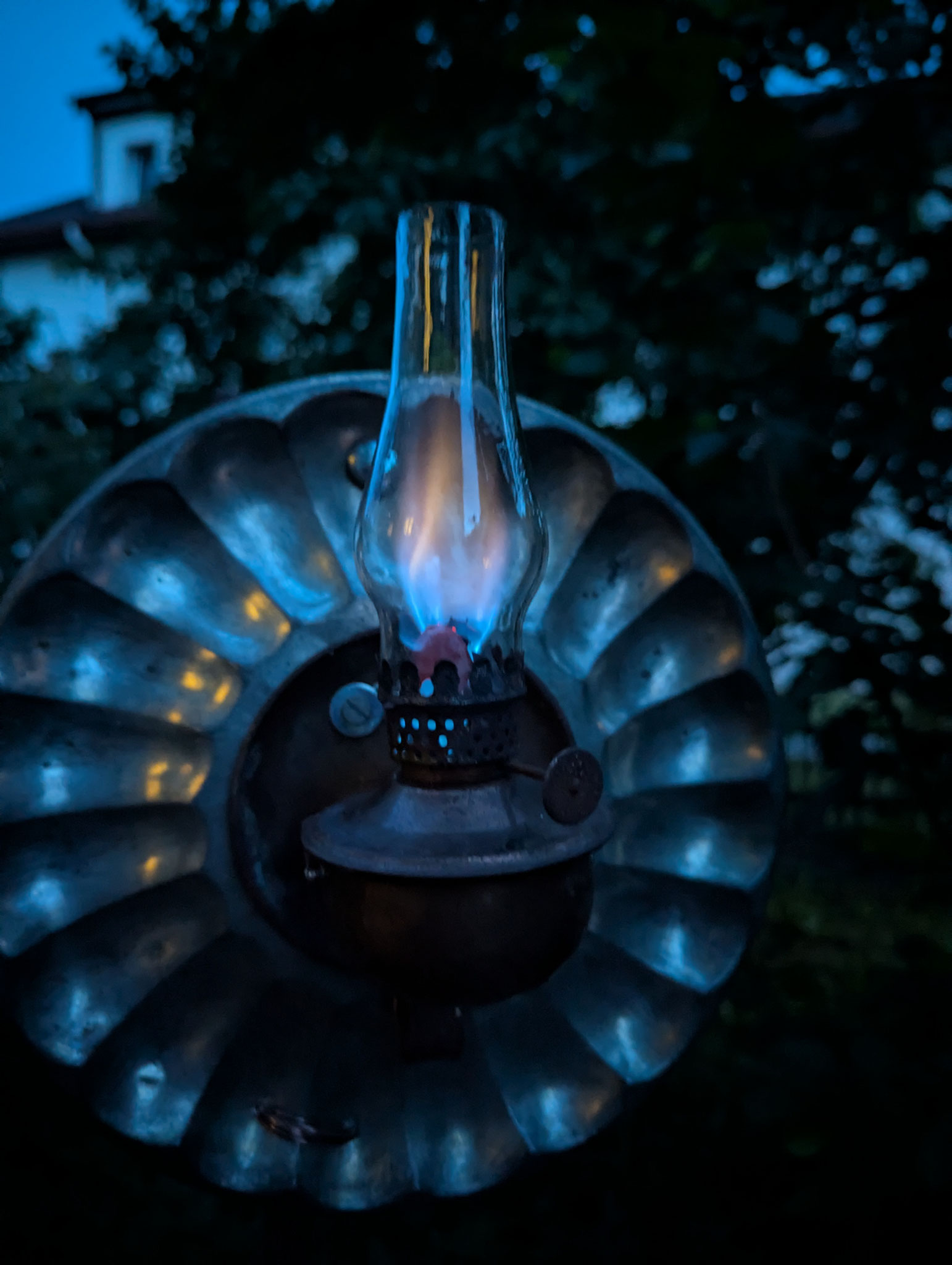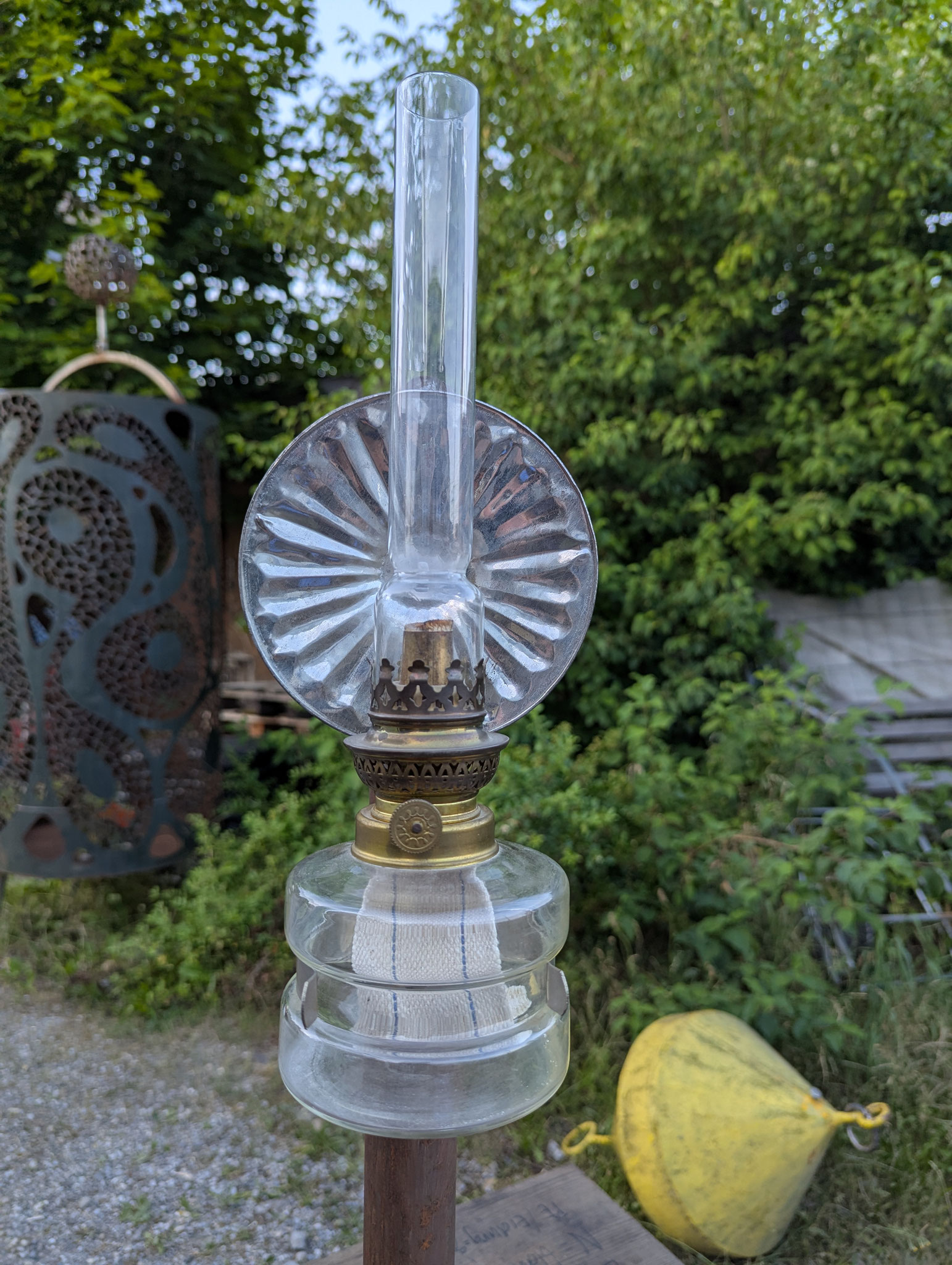 Eine schlichte Oellampe mit eisenem, soliden Fuss. Etwas schräg, aber schön stilvoll.